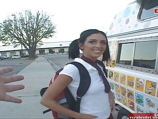 Dünne schwarzhaarige Studentin wird von hinten gefickt